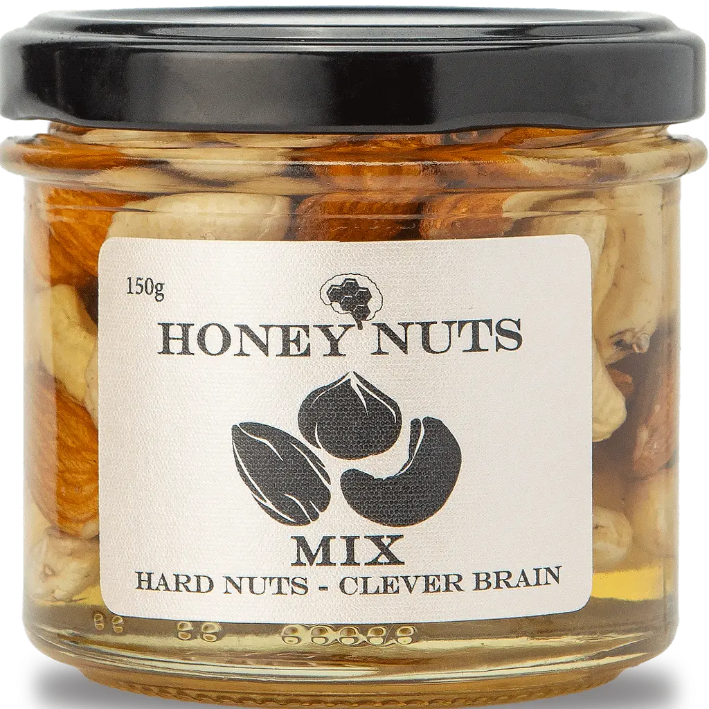 Мед з сумішшю горіхів містить фундук, мигдаль, кеш’ю. Горіхи залиті акацієвим медом, який завдяки високому рівню вмісту фруктози довго не кристалізується і залишається в рідкому стані.