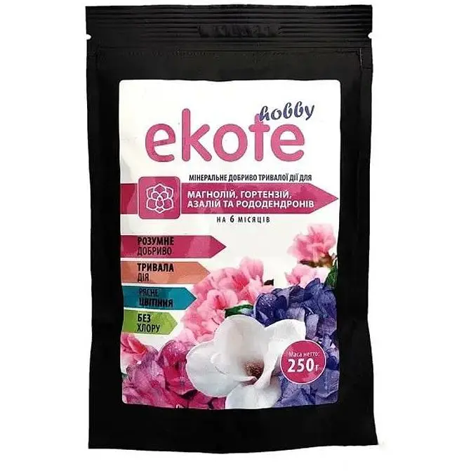 Мінеральне добриво ГТУ Ekote для гортензій, азалій, магнолій та рододендроно - це якісна збалансована суміш підвищення родючості землі. Варто один раз купити та внести в ґрунт добриво Ekote для магнолій, гортензій, азалій та рододендронів, і протягом пів року квітучі чагарники будуть забезпечені поживними речовинами.