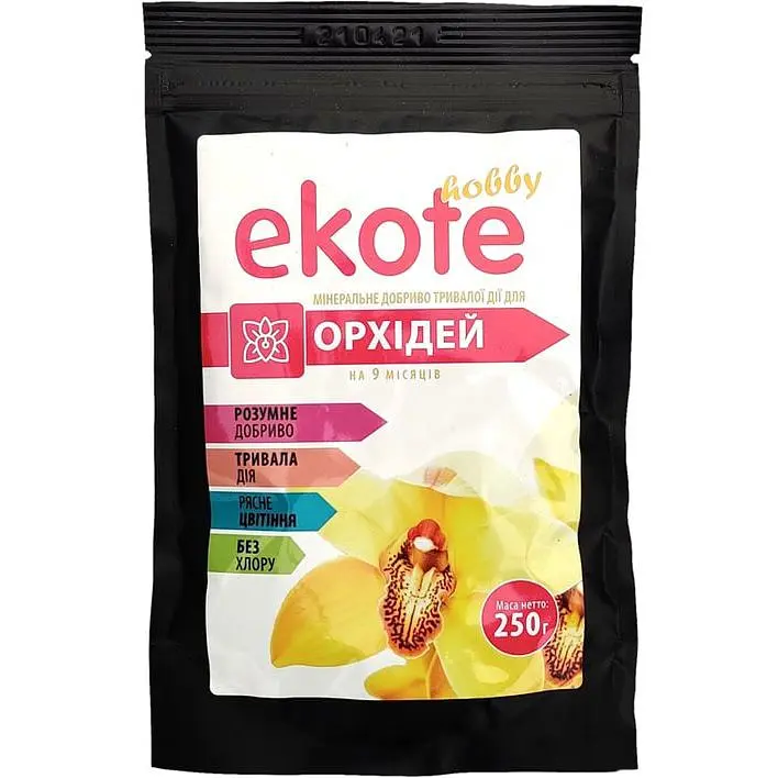 В упаковці 250 г препарату Еkote. Використовуйте добриво раз на 9 місяців під час інтенсивного росту та цвітіння орхідей. Суміш додають у поливну воду, вивільнення корисних речовин у прикореневій зоні орхідеї відбувається поступово, що забезпечує одержання щоденної дози добрив. Час розчинення гранул залежить від температури субстрату та їх насичення водою.