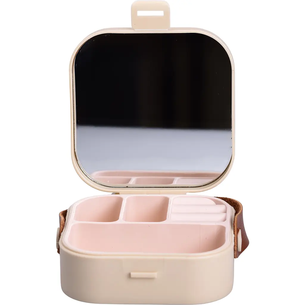 Футляр має один ярус із чотирма окремими відсіками, що дозволяє організовано розмістити каблучки, сережки, ланцюжки чи браслети. У кришці вбудовано дзеркальце, яке дозволяє швидко приміряти аксесуари або скоригувати образ будь-де.