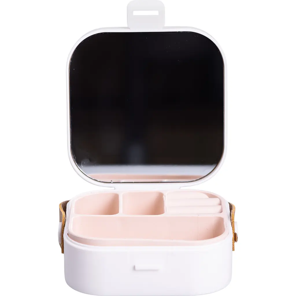 Футляр має один ярус із чотирма окремими відсіками, що дозволяє організовано розмістити каблучки, сережки, ланцюжки чи браслети. У кришці вбудовано дзеркальце, яке дозволяє швидко приміряти аксесуари або скоригувати образ будь-де.