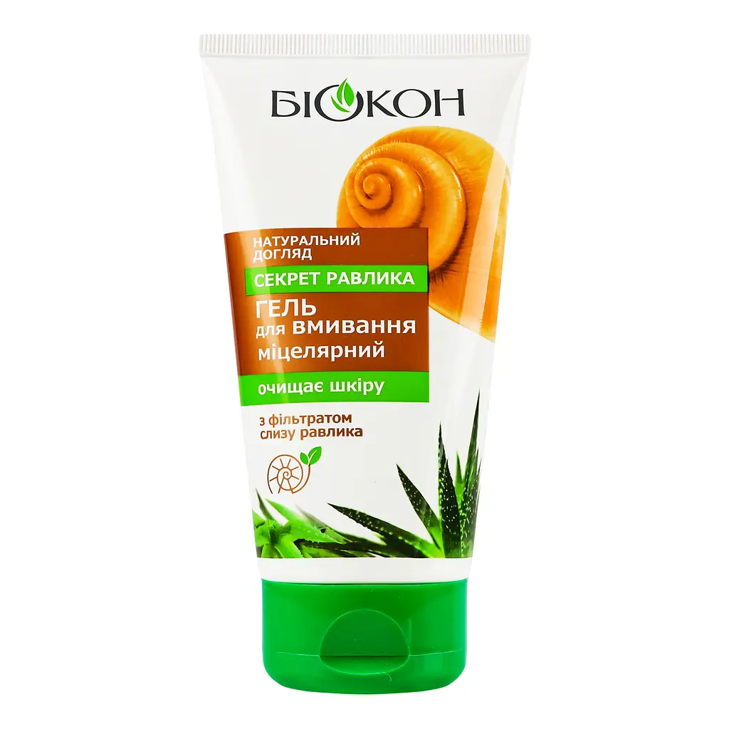 Міцелярний гель для вмивання Біокон Натуральний догляд Секрет равлика ефективно усуває залишки декоративної косметики, очищує від токсинів та забруднень, даруючи шкірі відчуття свіжості та чистоти. Фільтрат слизу равлика пом'якшує та зволожує шкіру, перешкоджає появі подразнень.