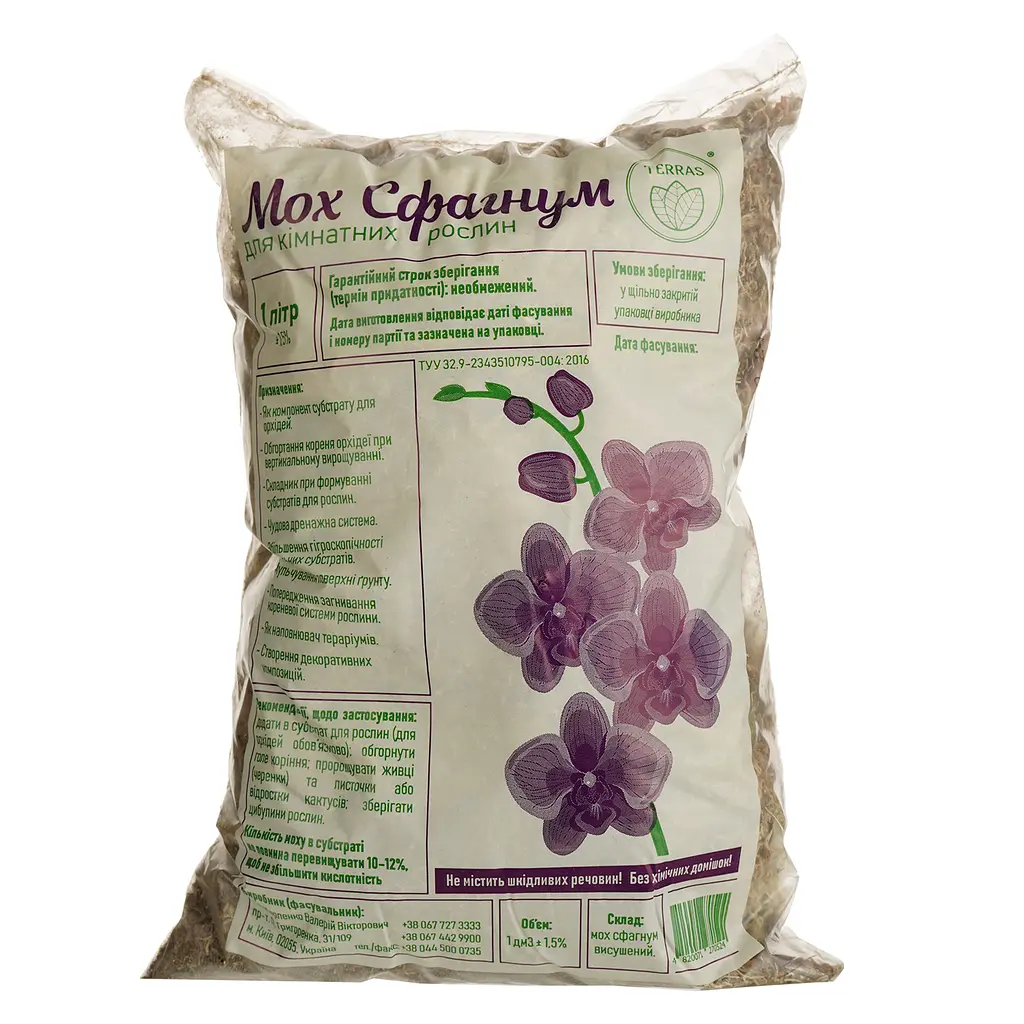Мох Сфагнум Terras - природний матеріал багатоцільового використання. Є екологічно чистим добривом, захистом від бактерій і грибів, а також ідеальним дренажем. Пресований торф'яний мох насичує воду як губка і поступово віддає її в ґрунт. Можливе також використання для мульчування ґрунту. Необхідна добавка для всіх кімнатних рослин.