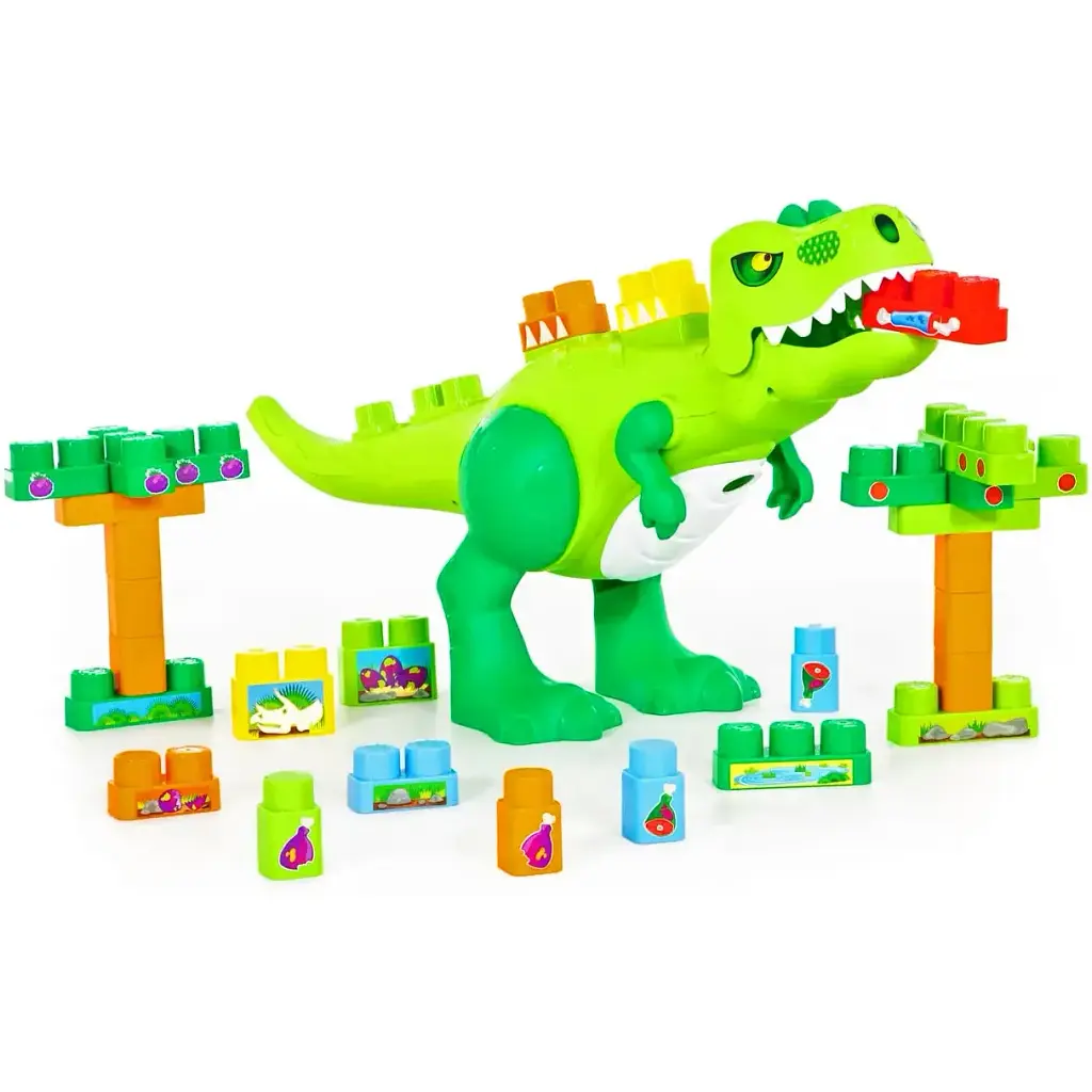 У пащу динозавра можна покласти блоки конструктора і вони потраплять у спеціальну нішу, яка знаходиться в животі іграшки. Щоб відкрити динозаврика достатньо лише потягнути за отвір у нижній частині конструкції.