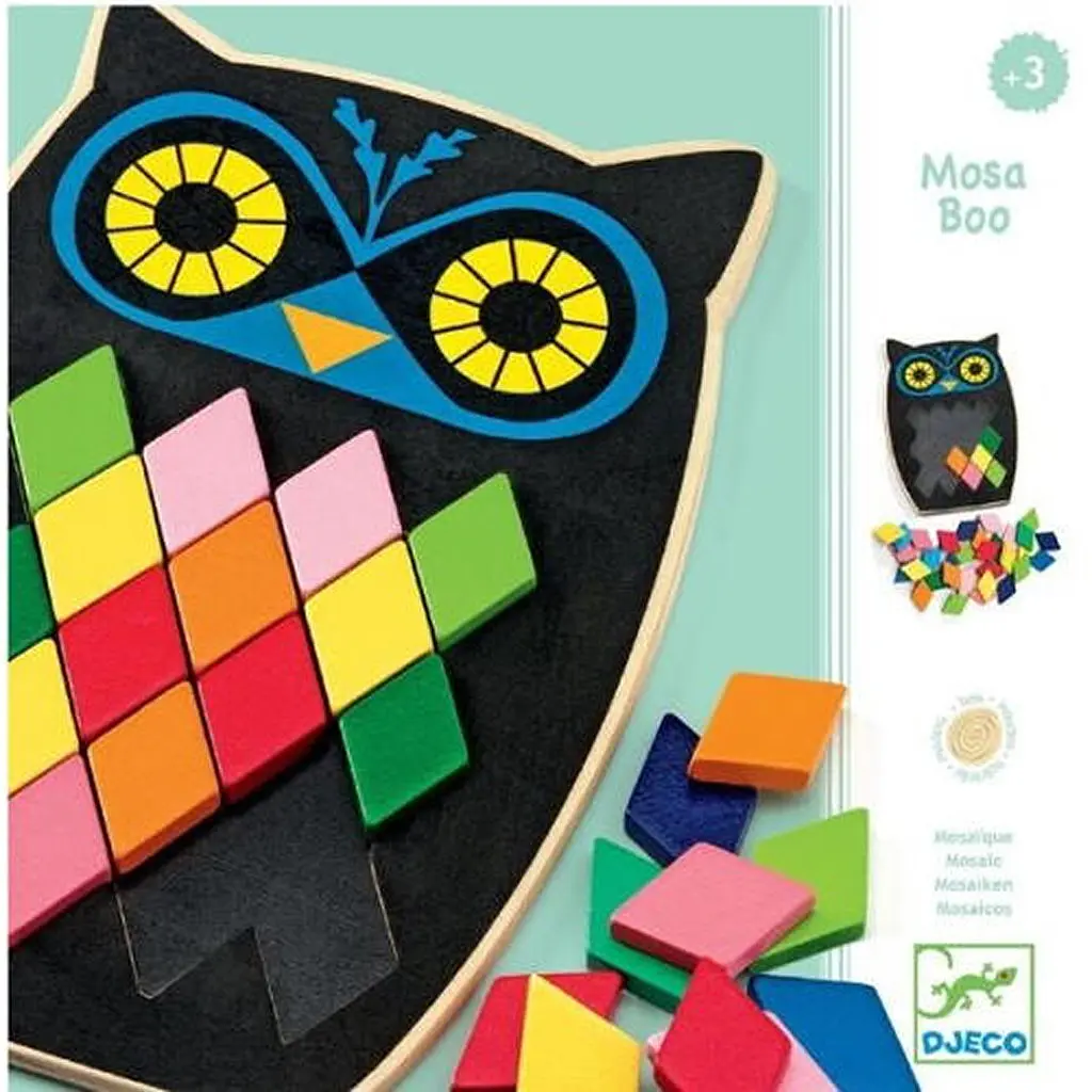 Мозаїка Мозаїка Моза Boo знає, чим здивувати та порадувати ваших дітей. Розроблена вона молодими французькими фахівцями та психологами. Під час гри малюкам належить на шаблоні з совою складати різні варіанти колірної мозаїки. Ідеально підходить для дітей віком від 3 до 6 років.