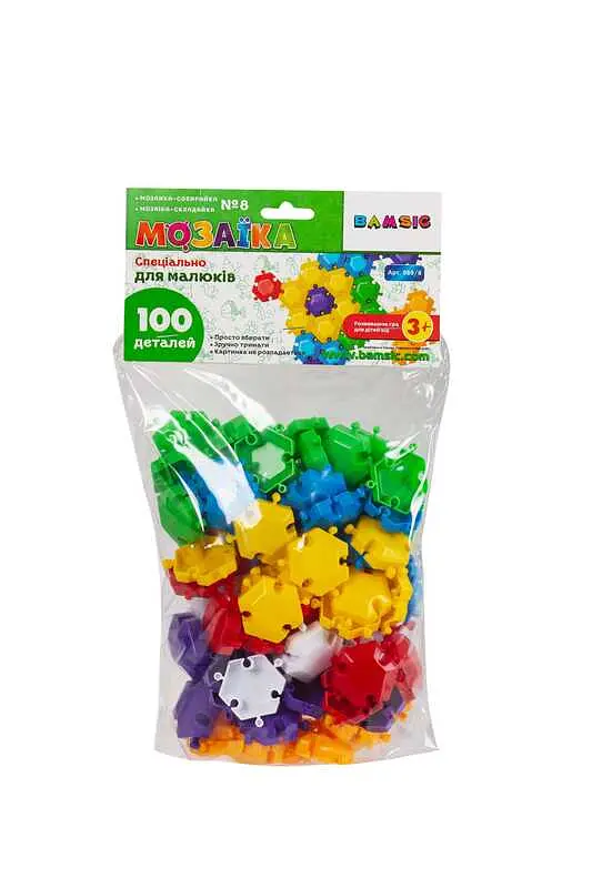 Мозаїка пазл - захоплива гра для дітей старше 3-х років. Вона розвиває у дитини творчі здібності, фантазію, координацію рухів, дрібну моторику рук і орієнтацію в просторі. Малюнки подання на упаковці, тільки приклад, оскільки це універсальна мозаїка відкриває перед дитиною можливість моделювати та створювати безмежну кількість власних фігур і малюнків. Елементи виготовлені з легких, ударостійких, високостійких матеріалів, які легко миються та абсолютно безпечні для дитини. Дизайн елементів дає дитині унікальну можливість легко переставляти фішки, розташовані в центрі створеного малюнка. Спеціально розроблений вид кріплення допомагає створювати рухомі пластичні конструкції. Розвиваюча гра для дітей від 3-х років. У наборі 100 деталей. Упаковка: пакет Розмір упаковки: 16 х 6 х 31 см * Характеристики товару та упаковка можуть змінюватися виробником без попередження.