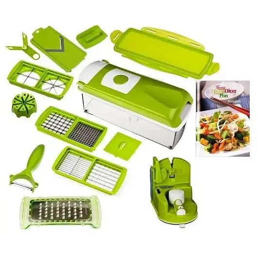В комплект Nicer Dicer Plus входить 14 предметів - все, що Вам могло знадобитися на кухні. Відкладіть незграбні та небезпечні кухонні ножі убік – замініть їх сучасним інструментом. Крім різноманітних лез для нарізування кубиками та скибочками, ви також отримуєте двосторонній ніж для видалення лушпиння, герметичну кришку, яка зберігає їжу свіжої, ріжуче лезо V-подібної форми, терку.
