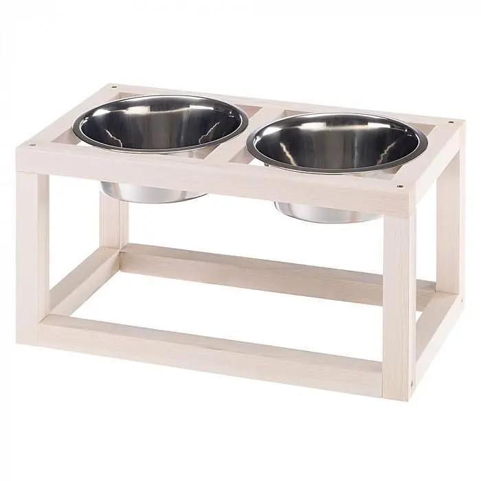 Ця чудова підставка з мисками стане чудовою прикрасою вашої кухні. Виріб має основу з сірого дерева, що є досить незвичайним. Дві знімні миски можуть використовуватися як для однієї собаки або кішки для їжі чи води, так і для пари улюбленців. Ємності виготовлені з нержавіючого металу, який чудово миється. Доступні три розміри на вибір залежно від породи тварини. Підставка має гумові накладки на ніжках для стійкості на підлозі.