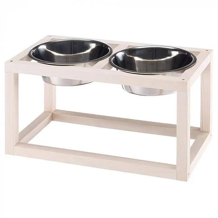 Ця чудова підставка з мисками стане чудовою прикрасою вашої кухні. Виріб має основу з сірого дерева, що є досить незвичайним. Дві знімні миски можуть використовуватися як для однієї собаки або кішки для їжі чи води, так і для пари улюбленців. Ємності виготовлені з нержавіючого металу, який чудово миється. Доступні три розміри на вибір залежно від породи тварини. Підставка має гумові накладки на ніжках для стійкості на підлозі.