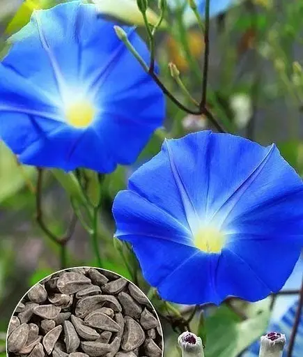 Іпомея "Блакитна" - це однорічна витка рослина, висотою 2 - 4 м. Квітки великі, воронкоподібні, діаметром до 10 см, блакитного кольору, розкриваються тільки вдень, у похмуру погоду і на ніч вони закриваються.