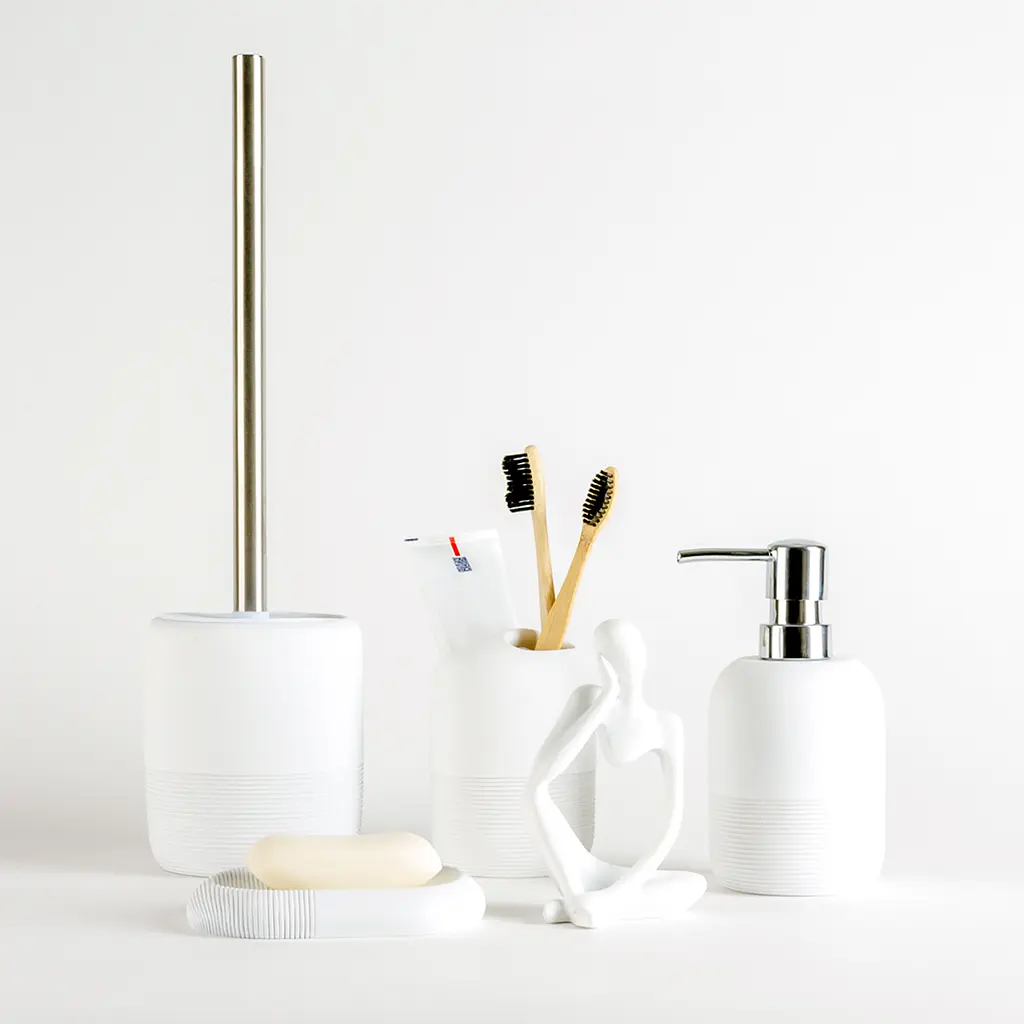 Комплект складається з мильниці, підставки для зубних щіток, диспенсера, йоржика, статуетки та органайзера (лише в чорному кольорі).