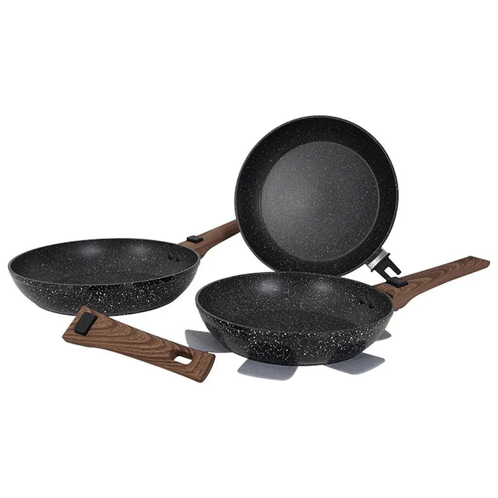 Набір включає три сковорідки Ø 22, 24 і 26 см. Увесь посуд має 4-слойне мінеральне антипригарне покриття всередині, що дозволяє рівномірно розподіляти тепло і запобігати пригоранню. Зовнішня сторона посуду покрита жаростійкою порошковою фарбою, що забезпечує зносостійкість і збереження естетичного вигляду сковорідок протягом тривалого часу. Завдяки знімній ручці сковорода підходить не тільки для смаження і тушкування, але й для запікання в духовці при температурі до 160ºС.