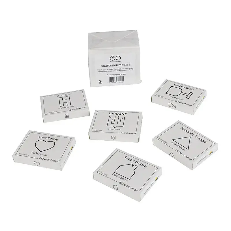 Набір міні-головоломок Заморочка Wooden mini puzzle set #2 (6 штук) із завданнями на англійській мові. До набору увійшли найпопулярніші плоскі головоломки, завданням яких є скласти фігурку, зображену на упаковці. Такі собі пазли-головоломки :-) Склад набору: Smart House, Ukraine, Bermuda Triangle, Love Puzzle, Broken Glass, H-Puzzle.