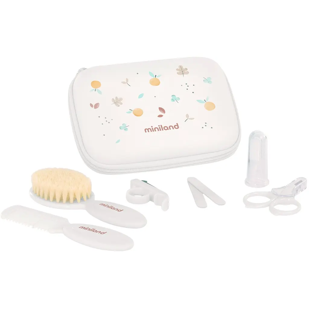 Набір для догляду за дитиною Miniland Baby Kit складається з необхідних елементів для щоденного догляду за дитиною: гребінця, щітки для волосся з натуральною щетиною, практичних ножиць із закругленими кінцями, силіконової щіточки для ясен, кусачок та пілочок для нігтів дитини. Всі елементи розташовані у симпатичній косметичці, яку завжди зручно брати із собою.
