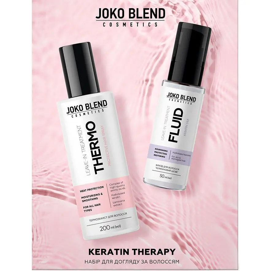 Набір для догляду за волоссям Joko Blend Keratin Therapy включає два незмивні засоби з для забезпечення комплексного рішення: спрей-термозахист від негативного впливу високих температур та флюїд "Кератиновий Шовк" для відновлення структури пошкодженого волосся.