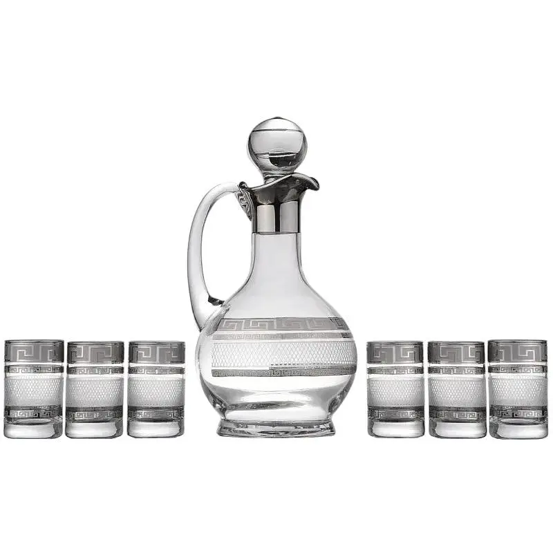 Набір для горілки з серії Медіо Lora виготовлений з кращого сучасного матеріалу богемського скла. Богемське скло має яскравий блиск і не містить ніяких шкідливих для людини речовин. Набір складається з графина, який має фігурну ручку, пробку, яка візуально нагадує крапельку дощу, і 6 стопок. Декорований набір геометричним візерунком сріблястого кольору в поєднанні з матовою сіточкою білого кольору.