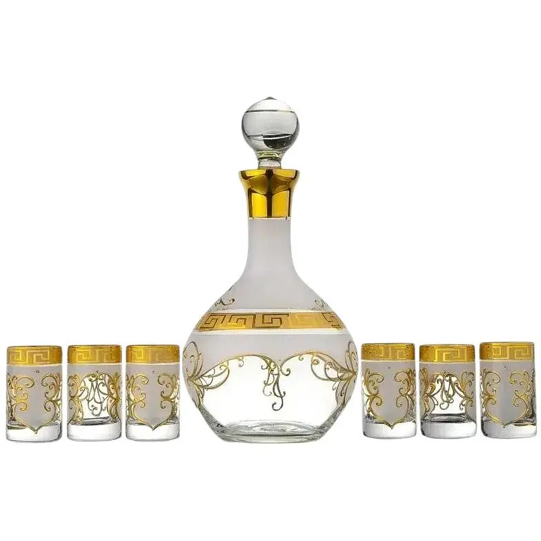 Набір для горілки Медіо включає в себе графин і 6 стопок. Він зроблений з якісного, справжнього богемського скла, яке надає набору особливого шарму. Декорований набір візерунками золотистого кольору, які чергуються з матовим покриттям білого кольору. Таке поєднання кольору є приємним для сприйняття. Форма графина обтічна, має плавні лінії. Відсутність ручки робить графин ще витонченіше і ніжніше. Пробка сприяє збереженню смаку горілки надовго. Стопки також мають зручну форму, яка допомагає легко і просто наповнювати їх. Набір потрібно мити вручну з мийним засобом, крім абразивних порошків і паст, які можуть залишити на поверхні подряпини. Набір для горілки стане практичним і стильним подарунком для ваших близьких.