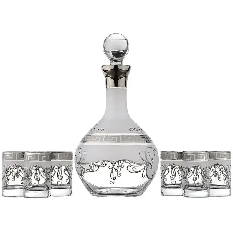 Набір для горілки Медіо - це поєднання якості і стилю. У набір входить графин і 6 стопок. Набір виготовлений з якісного, відомого на весь світ богемського скла, яке надає набору особливий шарм. Графин має обтічну форму, плавні лінії. Відсутність ручки робить його ще витонченіше і ніжніше. Також графин має пробку, яка дозволяє надовго зберегти смак і свіжість горілки. Набір потрібно мити вручну з мийним засобом, крім абразивних порошків і паст, які можуть залишити на поверхні подряпини. Набір декорований геометричними візерунками сріблястого кольору, які чергуються з матовим покриттям білого кольору. Таке поєднання кольору і форми дозволяє поставити набір в будь-якому куточку вашої кухні або вітальні. Набір для горілки Медіо прикрасить святковий стіл і стане відмінним подарунком для ваших близьких.
