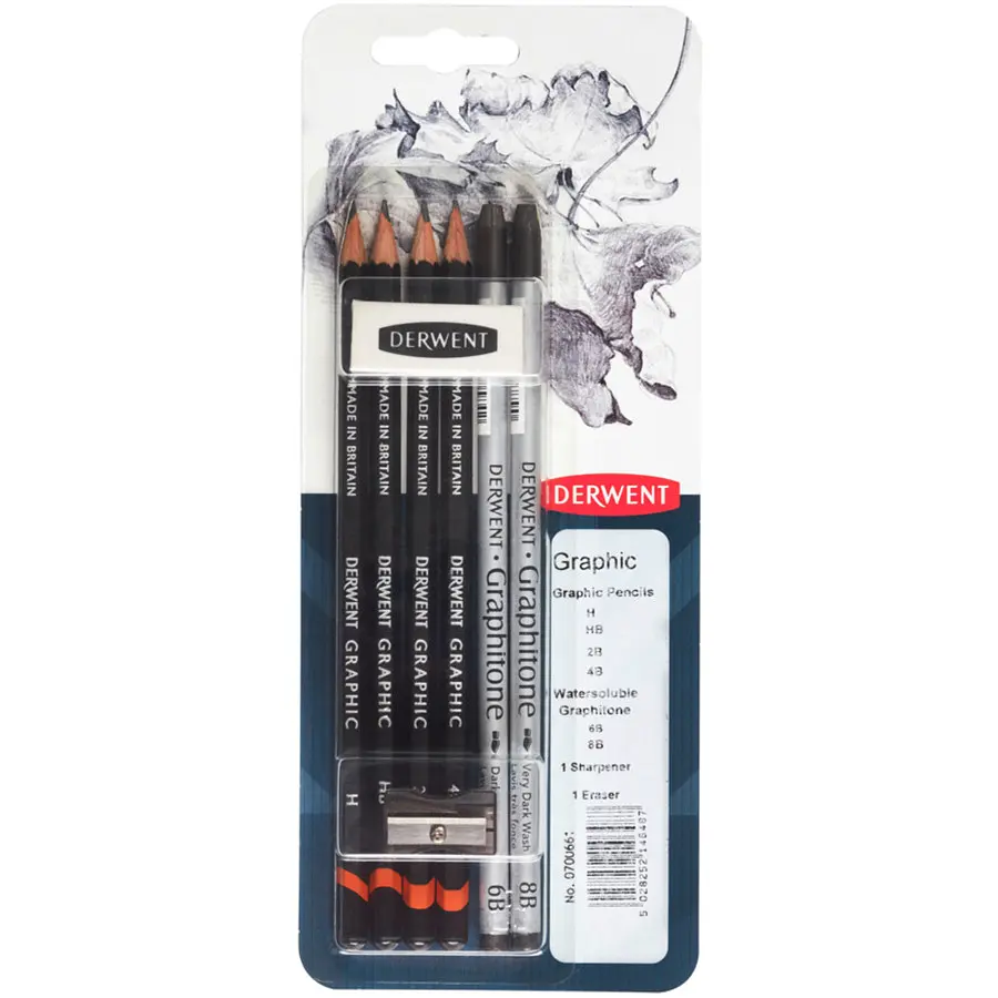 До кінця акції 303 дніНабір матеріалів графіки Graphic, 8 предметів, в блістері, Derwent містить 2 водорозчинних стрижня Graphitone (6В та 8В), 4 графітних олівця (4В, 2В, НВ, Н), ластик та точилку для олівців. Даний набір дозволяє працювати у широкому діапазоні ступенів від чіткого H до м'якого та розмитого 8B, ви можете додати тонкі деталі, затінення та текстуру.