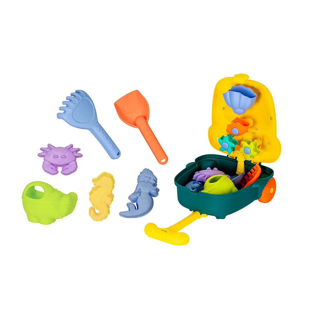 Яскравий зелений колір привертає увагу, а ергономічні ручки інструментів адаптовані для маленьких дитячих долоньок. Виготовлений з безпечного поліпропілену без вмісту BPA, набір є міцним та стійким до ударів. Після гри інструменти легко миються, що дозволяє підтримувати їх у належному стані для наступних прогулянок.