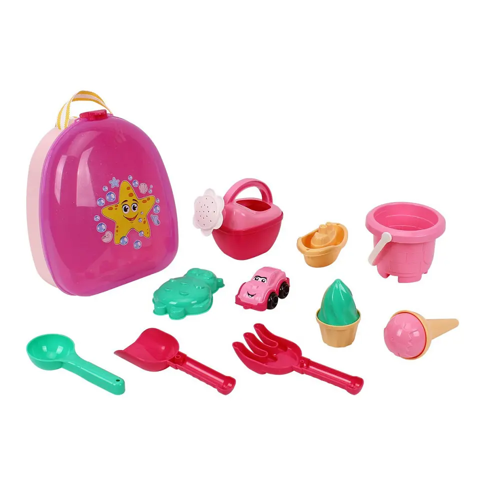Набір для гри з піском ТехноК арт.0310 у рюкзаку виконаний в рожевій гаммі кольорів - чудове поєднання комфорту, стилю та сучасних іграшкових трендів. У наборі зібрано все необхідне для творчих ігор у пісочниці, чи на пляжі. Маленьке відерце стане в нагоді для гри й створення унікальних піщаних замків. Яскраві грабельки та лопатка допоможуть вашій дитині створювати різноманітні фігурки з піску. Завдяки формочці у вигляді тваринки дитина зможе легко ліпити милі скульптури. Лійка допоможе швидко зволожувати пісок для кращого формування будівель, а також підійде для поливу квітів та дерев у садку. У набір також входить кораблик та міні-самоскид для урізноманітнення гри та розвитку фантазії малечі. А головна родзинка цього набору – це оригінальні формочки для піску у вигляді морозива в ріжку та кекса з вершками. Із такими іграшками дитина може влаштувати власний кіоск з морозивом та запросити друзів гратися разом. Для батьків набір теж дуже зручний: усі необхідні речі для прогулянки зібрані в одному місці. Після гри іграшки можна скласти в рюкзачок і легко переносити. Елементи набору та сам рюкзачок легко миються під проточною водою і швидко сохнуть, готуючись до нових ігор. У наборі 13 елементів: рюкзак – 1 шт., відерко – 1 шт., лійка – 1 шт., лопатка – 1 шт., граблі – 1 шт., машинка – 1 шт., кораблик – 1 шт., формочка «тваринки» – 1 шт., стаканчик ріжок – 1 шт., формочка кекс – 1 шт., формочка півкуля – 1 шт., формочка конус – 1 шт., ложка – 1 шт.