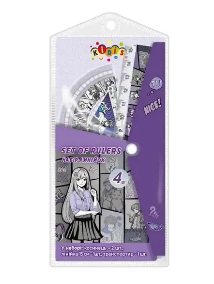Набір для креслення Kidis Anime, лінійка 15 см, 2 косинці, транспортир, 2 шт. в упаковці