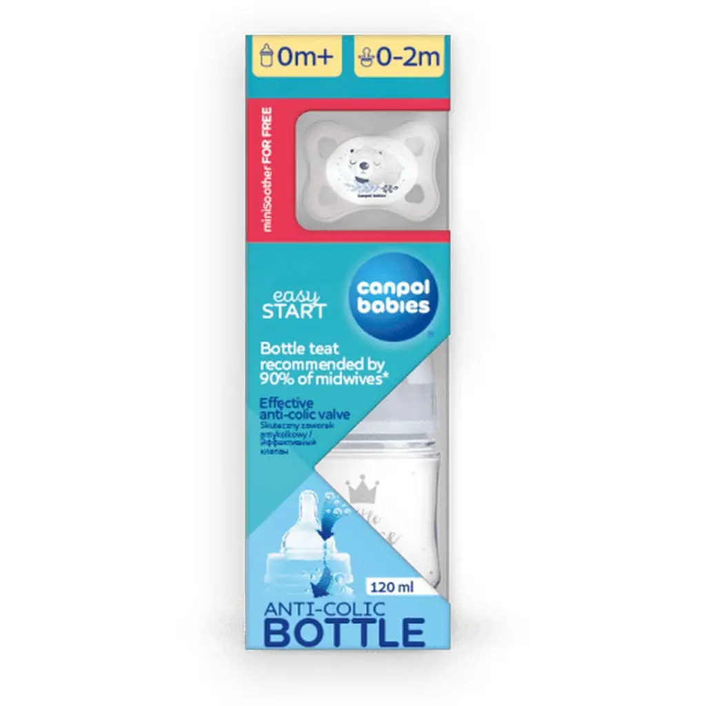 Набор для новорожденных Бутылочка 120 мл + Пустышка MINI Boy от Canpol babies содержит необходимые для начала продукты, приготовленные с мыслью о наилучшей подготовке к встрече новорожденного малыша. Мягкая и безопасная силиконовая соска, без вкуса и запаха, облегчает принятие малышом бутылочки, по форме напоминает грудь мамы. Эффективный антиколиковый клапан предотвращает образование пузырьков в пище, способствует выходу воздуха и уменьшает риск возникновения колик. Бутылочка изготовлена из безопасного, современного материала, легкая и прозрачная. Профилированная форма - обеспечивает комфортное держание бутылочки во время кормления. Облегчает сочетание грудного вскармливания и кормления из бутылочки. Понятная и четкая шкала - облегчает точность измерения пищи и позволяет контролировать сколько съел малыш. Широкое отверстие позволяет легко приготовить смесь и мыть бутылочку. Совместима с молокоотсосами Canpol babies. Самая маленькая симметричная соска в ассортименте - меньше чем в пустышках 0-6 месяцев, разработана для обеспечения комфорта даже особо маленьких деток. Не утяжеляет прикус малыша. Соска изготовлена из высококачественного силикона без вкуса и запаха. Легкая основа без ручки - для максимального комфорта самых маленьких деток. Специально выпрофилированная форма под носиком - для свободного дыхания Отверстия в основании пустышки обеспечивают свободную циркуляцию воздуха, что предотвращает раздражение кожи малыша.