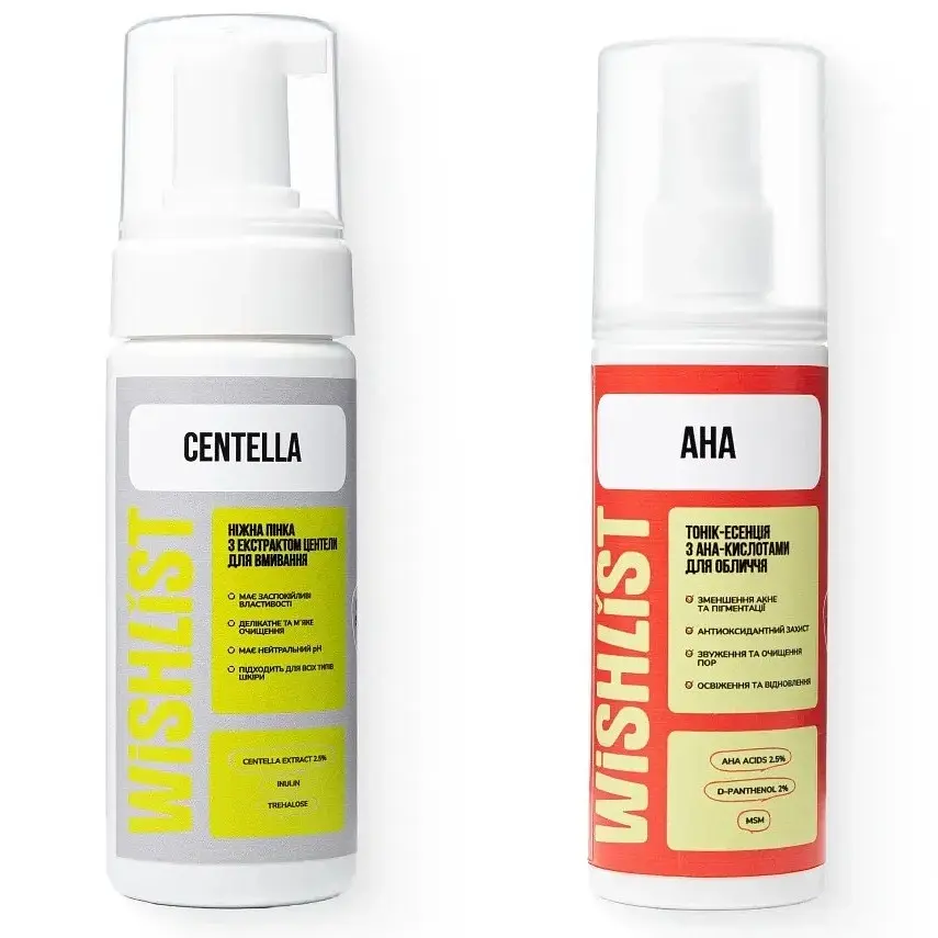 Набор для очистки и уменьшения воспалений Wishlist створений для ретельного очищення та заспокоєння шкіри, схильної до запалень. Ніжна пінка з екстрактом центелли м’яко видаляє забруднення, забезпечуючи комфорт і свіжість, а тонік-есенція з AHA-кислотами допомагає оновити шкіру, вирівнюючи її текстуру та тон.