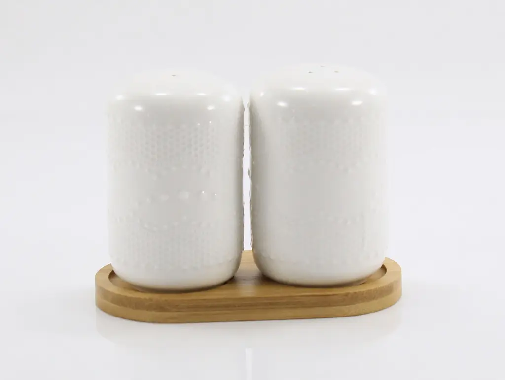 Набір для спецій Grazie — це не просто кухонне приладдя, а стильний елемент сервірування, який підкреслить ваш бездоганний смак. Набір складається з двох керамічних ємностей для солі та перцю, розміщених на компактній бамбуковій підставці. Білосніжна поверхня кераміки прикрашена делікатним рельєфним візерунком, який приємний на дотик і запобігає ковзанню ємностей у руках.