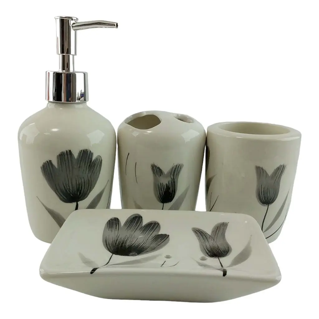 З чарівним набором аксесуарів для ванної кімнати всі предмети будуть на своїх місцях. У керамічний набір входить дозатор для рідкого мила, склянка, органайзер для зубних щіток, мильниця.
