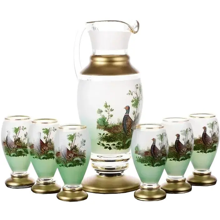 Набір для води Брутто складається з одного графина і шести склянок. Він виготовлений з якісного богемського скла, яке відрізняється чистотою і тонкістю. Графин і стаканчики прикрашені зображенням фазана. Набір можна використовувати для води, соку або компоту. Він обов'язково доповнить і прикрасить обідній стіл. Такий набір оригінальний подарунок для шанувальників полювання. Набір потрібно мити вручну з мийним засобом, крім абразивних порошків і паст, які можуть залишити на поверхні подряпини.
