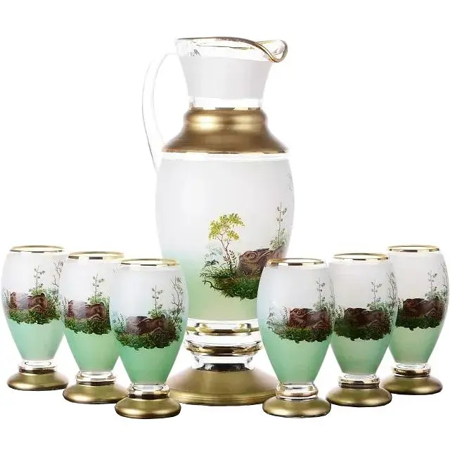 Набір для води Дром складається з графина і шести склянок. Він виготовлений з якісного богемського скла, яке відрізняється чистотою і тонкістю. Графин і склянки прикрашені зображенням зайця, який сховався в кущах. Набір можна використовувати для води, соку або компоту. Він доповнить і прикрасить будь-яку сервіровку обіднього столу. Такий набір оригінальний подарунок для шанувальників полювання. Графин відрізняється великим об'ємом 1700 мл, склянки по 250 мл. При такій місткості у графина досить компактні розміри: висота 304 мм, а діаметр 17 см. Набір потрібно мити вручну з мийним засобом, не можна застосовувати абразивні порошки та пасти, які можуть залишити на поверхні подряпини.