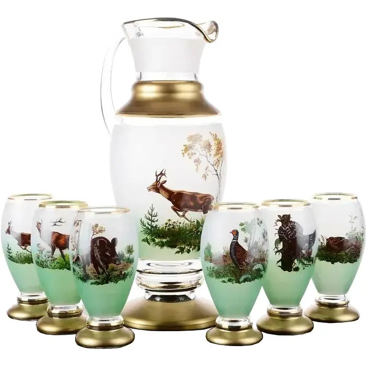 Набір для води Мерлен виготовлений з богемського скла, яке відрізняється особливою витонченістю і чистотою. Набір складається з одного графина і шести склянок. На графині зображений граціозний олень в лісі, а на стаканчиках такі тварини, як дикий кабан, заєць, фазан. Такий цікавий дизайн сподобається тим, хто захоплюється полюванням або просто любить відпочинок на природі. Набір можна також використовувати для соку або компоту. Він прикрасить ваш будинок, зробить його більш затишним. Набір для води це оригінальний подарунок для ваших близьких. Його потрібно мити вручну з мийним засобом, крім абразивних порошків і паст, які можуть залишити на поверхні подряпини.