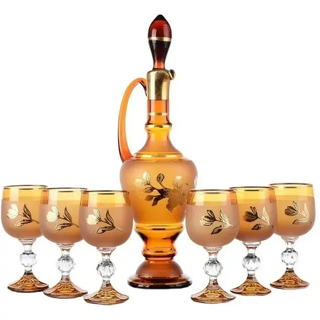 Набір для вина складається з одного графина з пробкою і шести келихів. Він виготовлений з чистого і тонкого богемського скла, яке створюється вручну методом видування. Графин і келихи світло-коричневого кольору, декоровані золотистим квітковим візерунком. Графин має зручну ручку та пробку для захисту і збереження неповторного аромату вина. Він досить місткий, але має компактні розміри: висота його 38 см, діаметр 10 см.