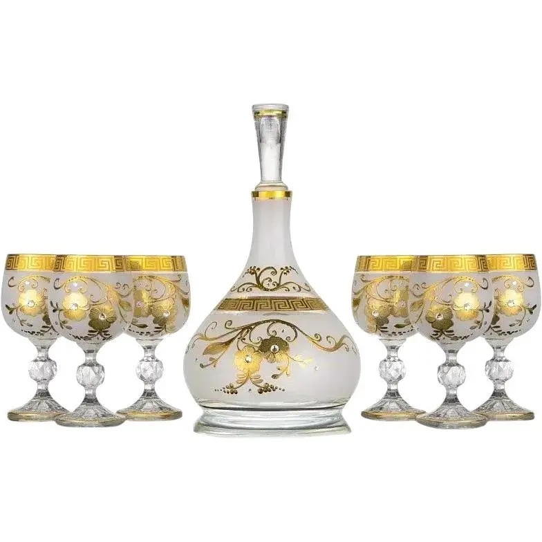Набір для вина Lora Ресина допоможе вам приємно провести вільний час в хорошій компанії, повільно і з насолодою дегустуючи улюблений напій у витонченому келиху, який найкращим чином розкриває смак і аромат напою! Набір Ресина складається з шести келихів і графина, декорованих золотистим візерунком, облямівкою, матовим склом і кристалами. Він виготовлений з богемського скла. Завдяки класичним формам і зручній ручці графин легко тримати в руці і використовувати. Келихи виконані у формі тюльпана. Ефектний набір для вина Lora Ресина прикрасить будь-який святковий стіл. Такий набір може стати відмінним подарунком до будь-якого свята. Набір потрібно мити вручну з мийним засобом, крім абразивних порошків і паст, які можуть залишити на поверхні подряпини.
