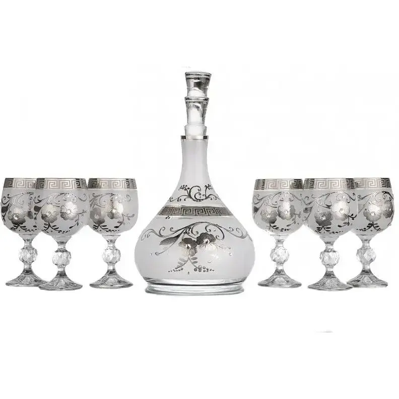 Набір для вина Lora Ресіна складається з шести келихів і графина, декорованих сріблястим візерунком, облямівкою, матовим склом і кристалами. Такий набір може стати відмінним подарунком до будь-якого свята, прикрасить і зробить вишуканим святковий стіл. Винні келихи в наборі виконані у формі тюльпана, яка допомагає розкрити аромат напою. Графин завдяки класичним формам і зручній ручці легко тримати в руці і використовувати. Набір для вина Lora Ресина допоможе виготовлений з вишуканого богемського скла. Його потрібно мити вручну з мийним засобом, крім абразивних порошків і паст, які можуть залишити на поверхні подряпини.