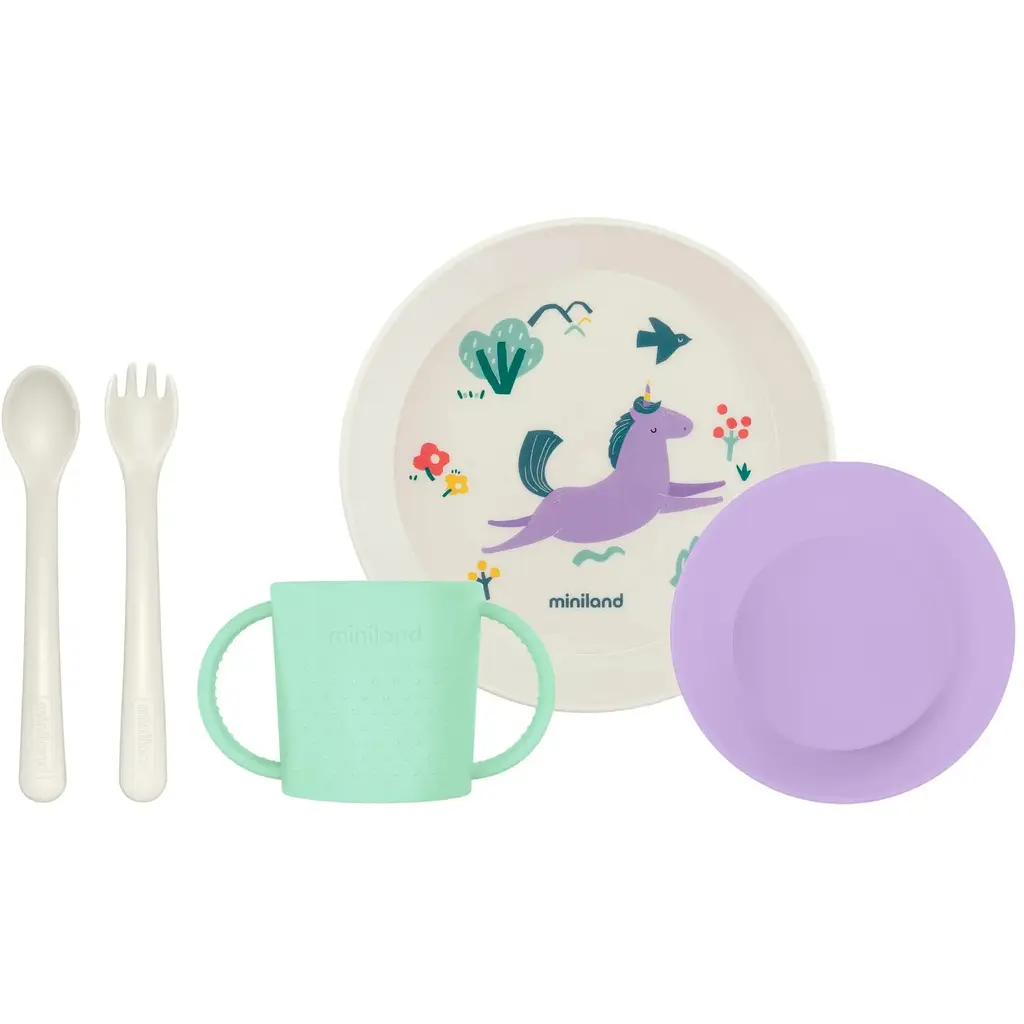 Набір дитячого посуду на 5 предметів ідеально підходить для переходу дитини до самостійного харчування. Він включає плоску тарілку з піднятими краями, глибоку мисочку, зручну чашку з текстурованими ручками для кращого захоплення дитячими ручками, а також ложку і вилку із закругленими краями, щоб запобігти пошкодженню ясен дитини.