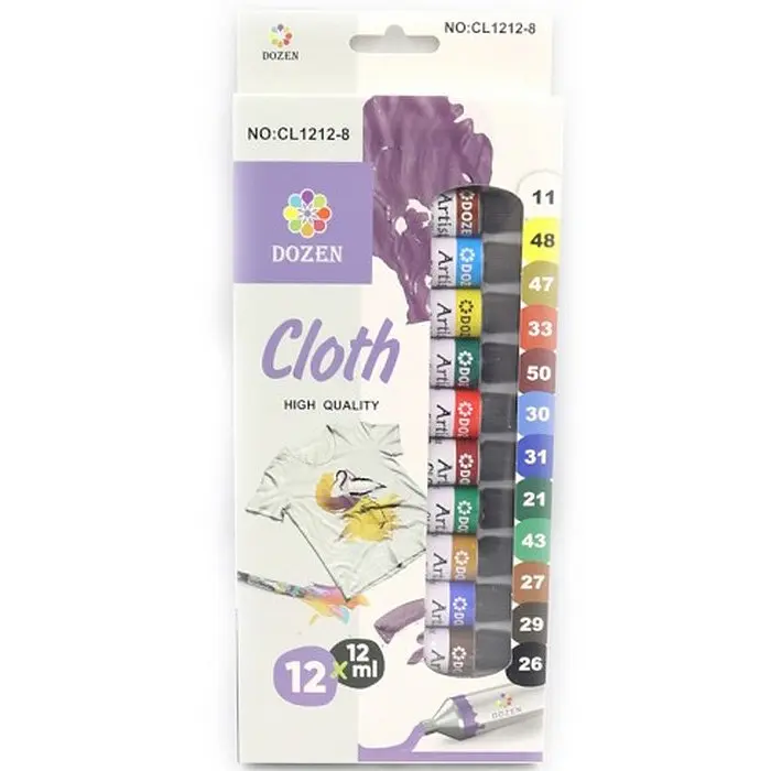 Бажаєте додати індивідуальності своїм речам? Набір акрилових фарб для тканини від Dozen це професійне рішення для кастомізації одягу в домашніх умовах. Фарби підходять для малювання на футболках, джинсах, кедах, еко-сумках та навіть на елементах домашнього декору (подушки, скатертини). Чому варто обрати набір Dozen? Насиченість та покривна здатність: Фарби мають густу консистенцію та високий вміст пігменту, що дозволяє створювати яскраві малюнки навіть на темних тканинах. Стійкість до зовнішніх впливів: Спеціальна формула акрилу після фіксації стає стійкою до вимивання. Ваш принт витримає багаторазове прання, зберігаючи чіткість ліній та яскравість кольорів. Гнучкість шару: Після висихання фарба не робить тканину дубовою. Малюнок залишається еластичним і не тріскається при природному розтягуванні тканини. Безпека: Фарби на водній основі, не мають різкого запаху і безпечні для використання в закритих приміщеннях. Зручність зберігання: Компактні тюбики по 12 мл надійно закриваються, що запобігає висиханню фарби між творчими сесіями.