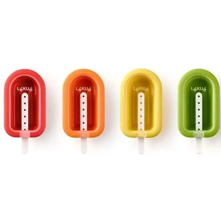 У набір входить чотири форми по 60 мл. Еластичний силікон дозволяють легко діставати з форми готове морозиво. Кришка запобігає всмоктуванню запахів з морозильної камери, а також дозволяє компактно складати форми в стопку для економії місця.