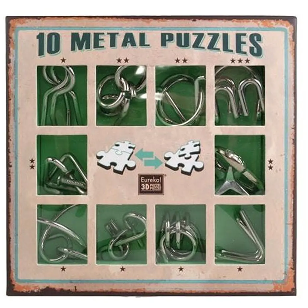 Що в коробці: 10 металевих головоломок.
