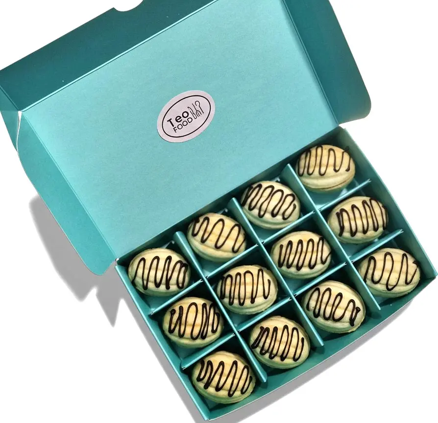 Склад: тісто - борошно пшеничне, яйця курячі, масло вершкове 82,5%, цукор, розпушувач, ванільний цукор, сіль. Начинка - молочний шоколад, вершки 30%, натуральна фундучна паста, фундук.