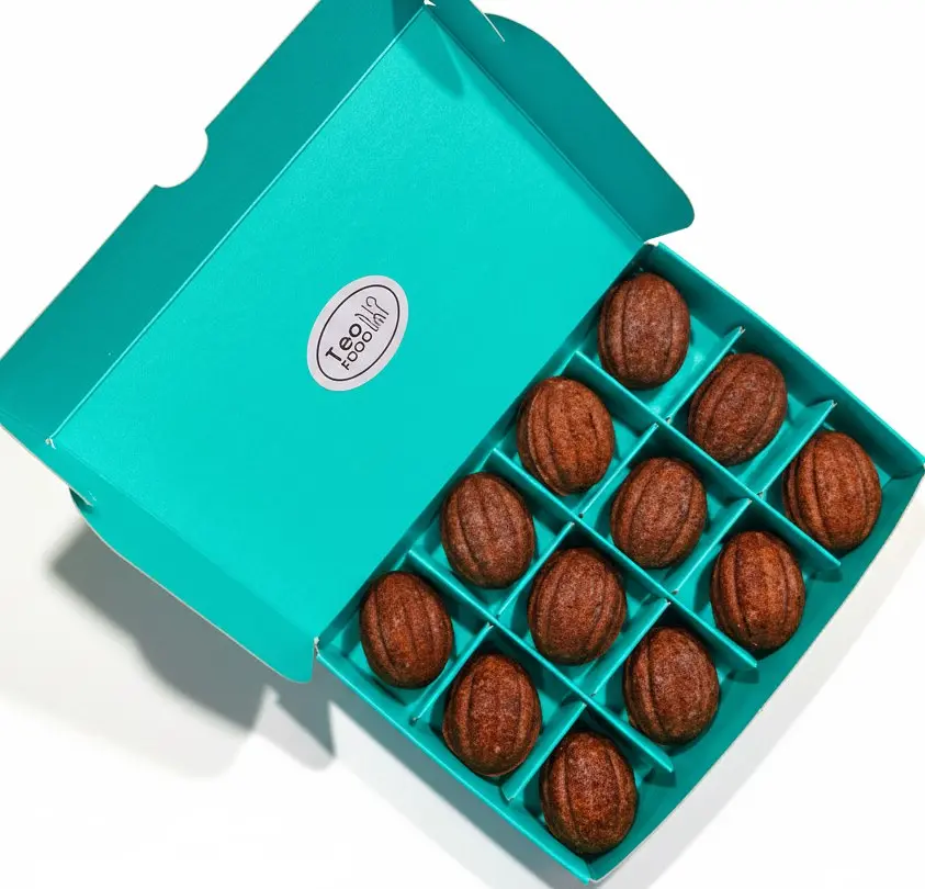 Склад: тісто - борошно пшеничне, яйця курячі, масло вершкове 82,5%, цукор, розпушувач, ванільний цукор, сіль, какао. Начинка - молочний шоколад, вершки 30%, натуральна арахісова паста без цукру, арахіс.