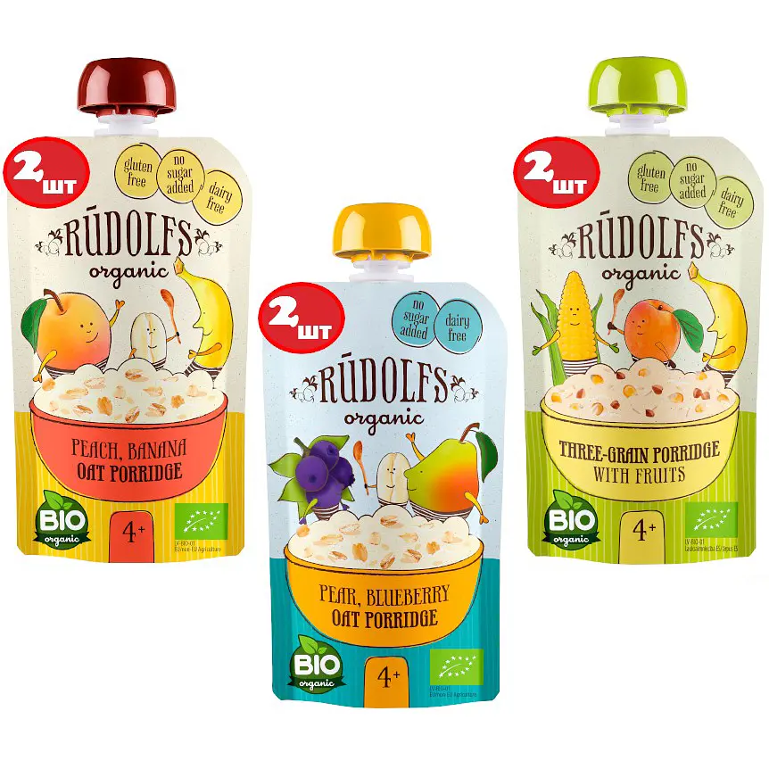 Готові каші Rudolfs з фруктами в зручному пакованні. Діти можуть тримати та їсти самостійно, що є важливою частиною розвитку дитини. Підходить як закуска на прогулянці, в автобусі, у машині або вдома.