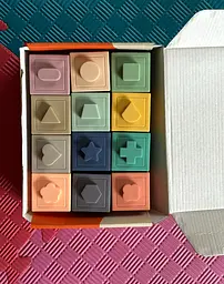 У комплект входить 12 м'яких кубиків, кожна грань яких прикрашена об'ємними зображеннями фруктів, тварин, цифр, математичних символів та геометричних форм. Кубики легко з'єднуються між собою, що сприяє розвитку моторики та уяви. Завдяки м'якому та безпечному матеріалу, кубики можна кусати та використовувати під час купання. Натискаючи на кубик, дитина почує кумедний звук, який викличе усмішку.