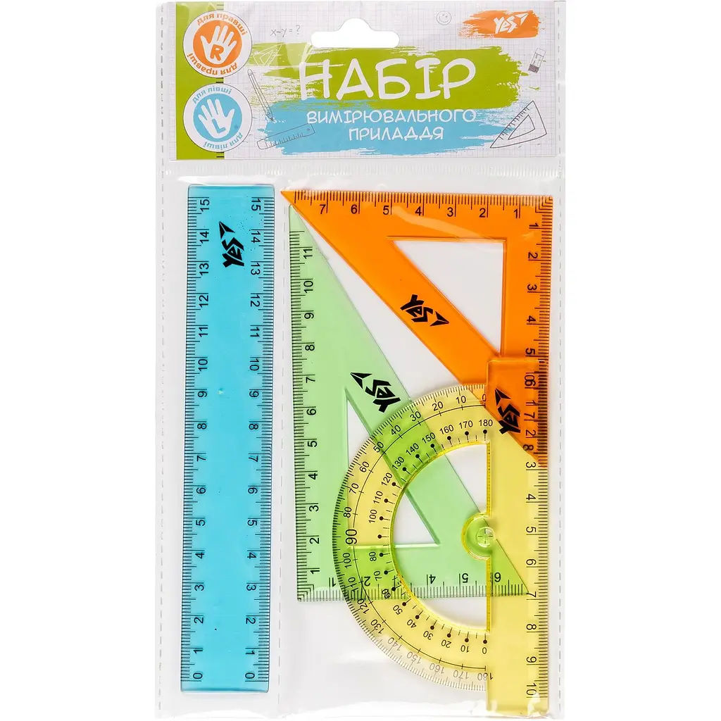 Комплектація: лінійка 15 см, транспортир 180°, трикутник рівнобедрений 8х8 см, трикутник прямокутний 11х6 см.