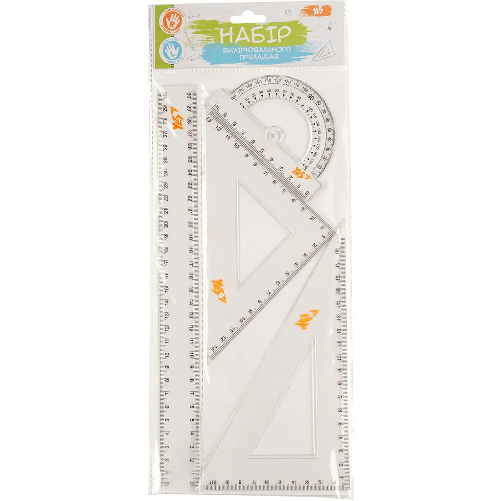 Комплектація: лінійка 30 см, транспортир 180°, трикутник рівнобедрений 13х13 см, трикутник прямокутний 18х10 см.