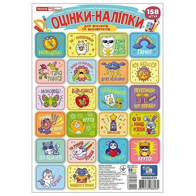 Унікальний формат заохочення без цифр - наліпки-оцінки з милими звірятами та мотиваційними фразами. Розроблені спеціально для вербального оцінювання - ідеальні для вихователів та вчителів молодших класів. 158 яскравих наліпок, які перетворюють навчання на гру та викликають щиру радість у дітей. Кожна наліпка - це похвала, підтримка і стимул до нових досягнень. Створюють позитивну атмосферу в групі чи класі, формують здорову самооцінку та впевненість у собі. Зручний формат - 4 аркуші розміром 160×230 мм, легко використовуються у зошитах, щоденниках, альбомах. Дизайн, що запам’ятовується: цікаві відтінки, сучасна графіка та емоційна подача. Наліпки подобаються не тільки дітям, а й батькам - це спосіб відзначити старання, який запам’ятається надовго! Оцінки-наліпки (бірюзові) - це яскравий і ефективний інструмент для мотивації дітей у навчанні. Ідеально підходять для вихователів та вчителів початкових класів, де традиційних оцінок ще немає, але так важливо заохочувати старання. 158 наліпок зі зворушливими фразами й кумедними звірятами перетворять навчання на захопливу гру. Малюки з нетерпінням чекатимуть на свою наліпку-похвалу - за старанно виконане завдання чи гарну поведінку. Кожен стікер - це посмішка, підтримка й натхнення. Вони легко приклеюються до зошитів, альбомів чи щоденників і стають особистими маленькими перемогами. Це простий, але дуже дієвий спосіб додати радості до щоденного навчання, стимулювати інтерес і впевненість у собі. Розмір аркуша: 160×230 мм. У наборі - 4 аркуші, 158 наліпок. Робіть навчання теплим, емоційним і справді цікавим!