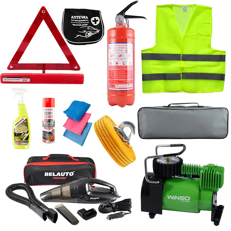 Компресор автомобільний Winso з автостопом 124000 Пилосос автомобільний «Торнадо» BA-53B 110 Вт, 3.5 кПа чорний BA53B Вогнегасник порошковий ВП2 VP2-X Аптечка перш.мед.допомоги типу АМА1,сумочка (мала) Знак аварійної зупинки WT101 Буксирувальний трос Carlife 3т, 4м TR702/P Жилет сигнальний BX18100 Auto Drive Очисник текстилю Textile Cleaner, 500мл AD0058 Поліроль для панелі приладів CarLife Cockpit Cleaner Extra Mat Полуниця, 500мл CF523 Ганчірка з мікрофібри CarLife 30x30 см, набір 3шт (для полірування та скла) CC915 Cумка органайзер велика BX011