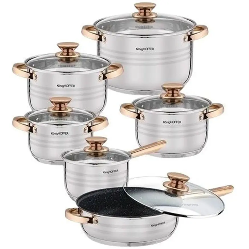 Пориньте у світ кулінарного мистецтва разом із набором індукційного посуду Konighoffer Bari Rose Gold! Цей вишуканий комплект із 12 предметів поєднує сучасний дизайн, якісні матеріали та функціональність, що робить його ідеальним вибором для будь-якої кухні.