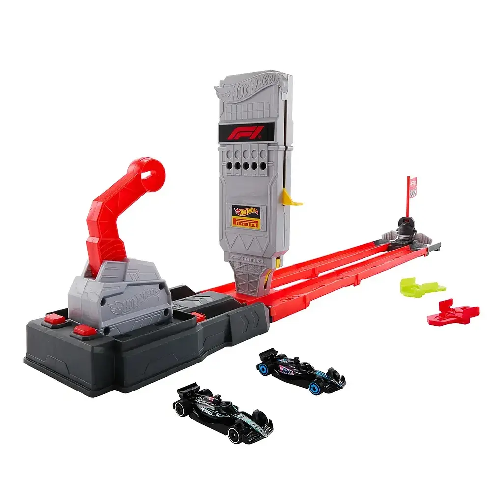 Ігровий набір Hot Wheels Старт F1 – це динамічний трек, який переносить азарт справжнього Гран-прі безпосередньо у вашу кімнату. Набір спроєктований для змагань у форматі пліч-о-пліч і має дві паралельні траси, що дозволяє одночасно запускати два боліди. Головним елементом набору є стартова вежа з механічним важелем: підніміть його, дочекайтеся сигналу та вчасно натисніть кнопки запуску. Швидкість вашої реакції визначить, хто першим перетне фінішну лінію, де переможця вітає справжній картатий прапор.